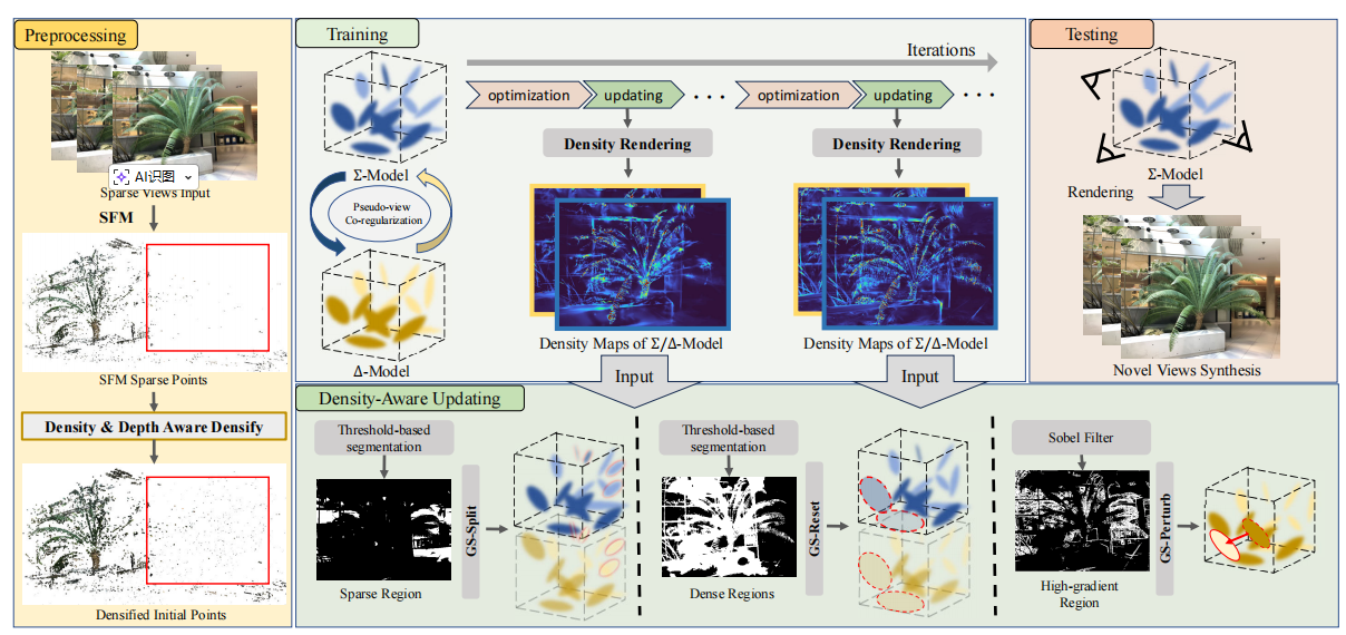 We propose a novel framework that mitigates density imbalance in 3D Gaussian Splatting for few-shot reconstruction.